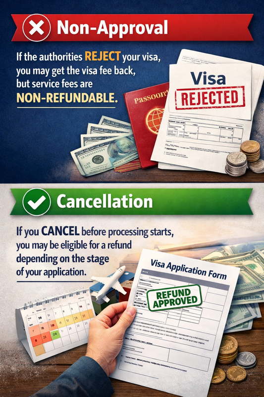 - Non-Approval: If the authorities reject your visa, you may get the visa fee back, but service fees are non-refundable.