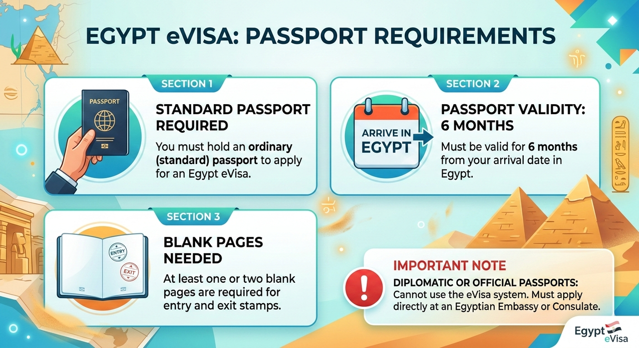 To apply for an Egypt eVisa, you must hold a standard (ordinary) passport.